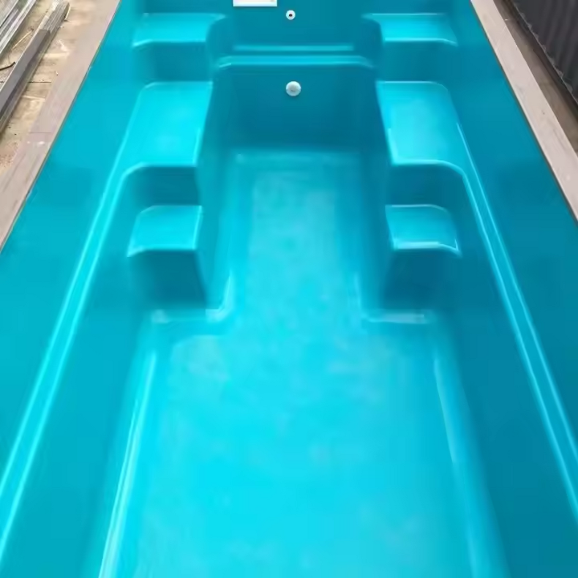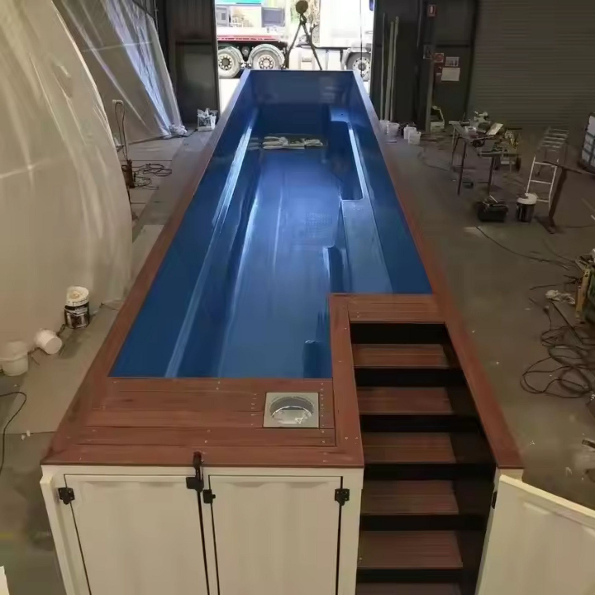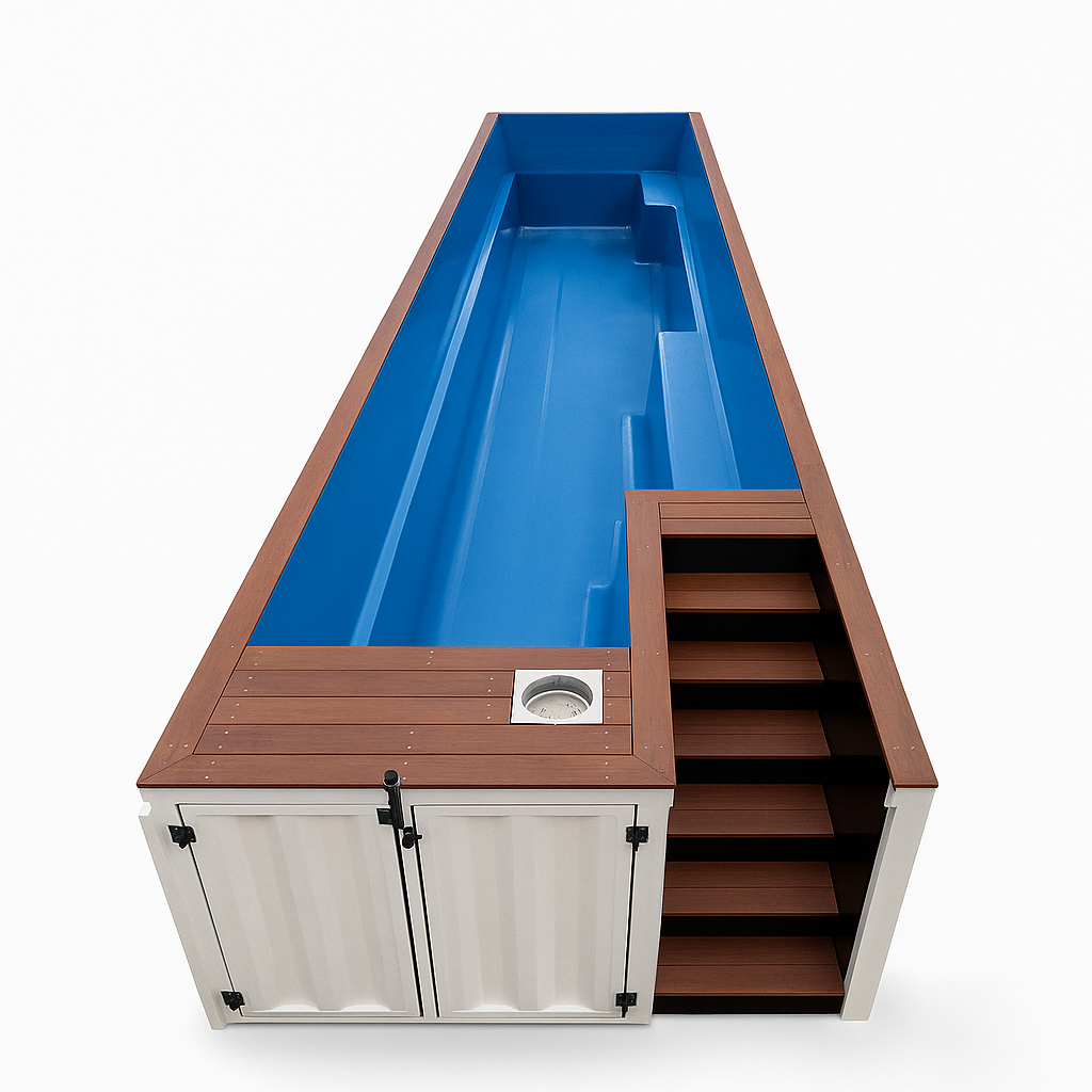 The BluEdge FlowStream 32 redefines at-home aquatic fitness with a compact, ergonomic design built into a reinforced container shell. Featuring a molded swim lane with elevated seating ledges, this above-ground lap pool offers effortless entry and a premium woodgrain deck with maintenance access. Designed for seamless integration into urban patios or backyards, the FlowStream 32 blends performance with compact luxury.