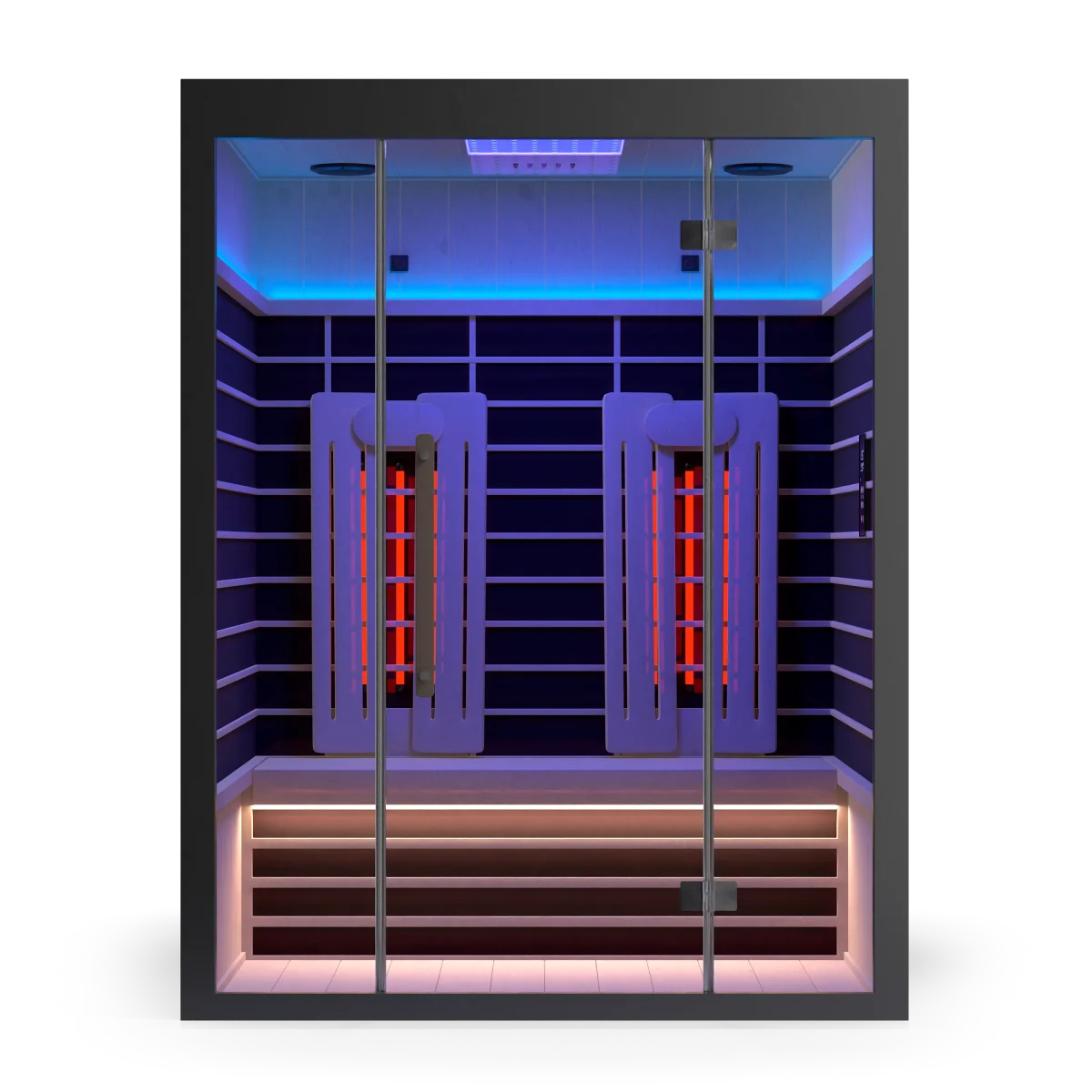 Crafted from high-quality Canadian Hemlock wood, the Calore Infrared Sauna features tempered glass doors and spacious dimensions that comfortably accommodate up to two people. Designed to quickly heat up to temperatures exceeding 165°F, it reduces wait times and delivers a deep, rejuvenating sweat.